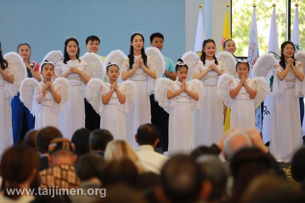 太極門聖塔克拉拉(Santa Clara)道館盛大開幕,紅毯步道上站滿了活潑可愛的「「足爽」(台語ㄊㄩㄥˇ)寶寶、手持金環的童子,以及為來賓送上祝福的彩球仙子、祥獅,熱鬧十足;待開幕活動一開始,氣勢磅礴的