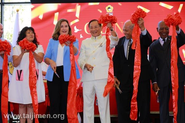 太極門聖塔克拉拉道館盛大開幕,掌門人洪道子博士(中)與矽谷多位市長、來自全球的貴賓一同剪綵。